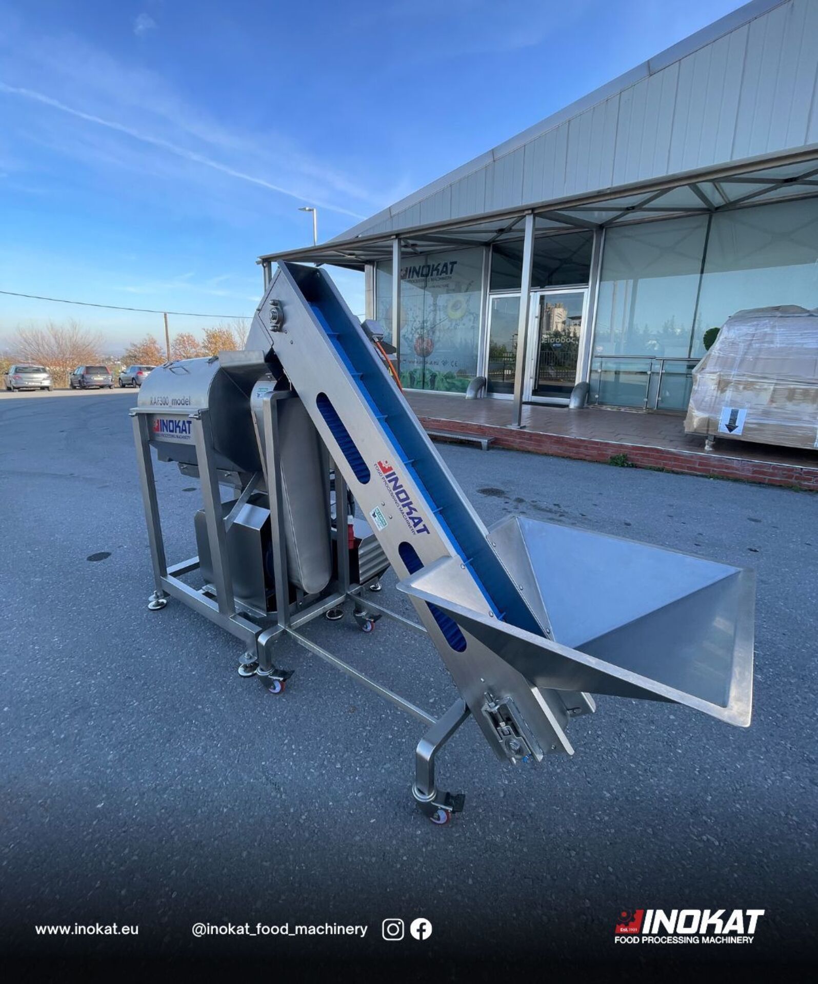 After inserting the product from the upper inlet, the processing continues with the help of a centrifugal shaft, that operates with the rotation of three brushes or plastic teflon blades in the stationary perforated drum and crushes the product